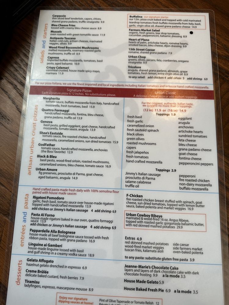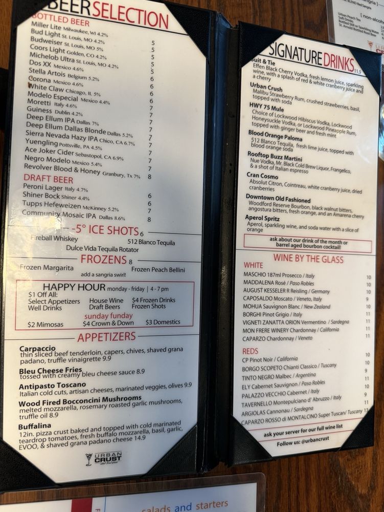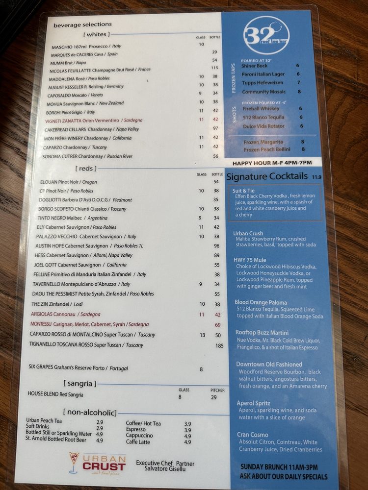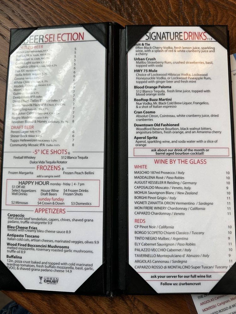 Urban Crust in Plano, TX, is a trendy beer bar serving up delicious pizzas and Italian cuisine. The menu features a variety of options, including vegan and vegetarian choices. With options for delivery, takeout, and reservations, Urban Crust is a versatile spot for dining. The restaurant boasts a 32 Degree Roof Top bar, offering a scenic view and a frozen bar for a unique experience. Customers praise the flavorful Lamborghini Pizza and refreshing cocktails like the Suit & Tie and Hwy 75 Mule. The attentive staff and relaxed ambiance make it a favorite among locals. Whether you're looking for a casual lunch or a night out with friends, Urban Crust promises a memorable dining experience with fresh ingredients and top-notch service.